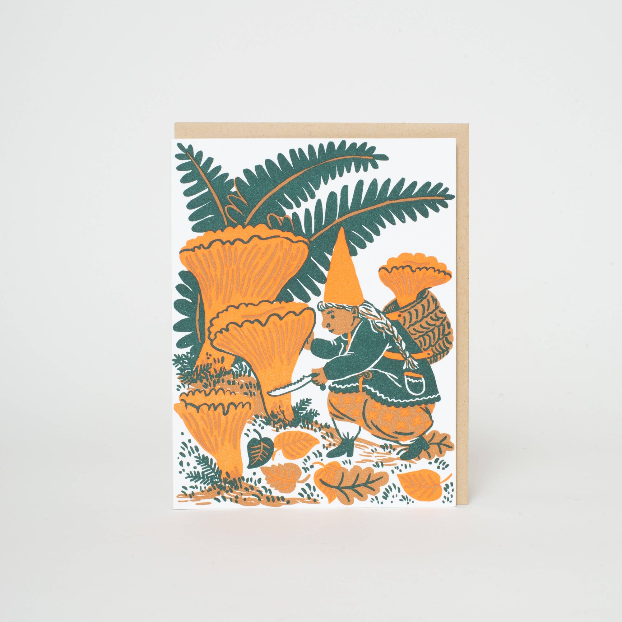 Mushroom Picking Gnome Letterpress Greeting Card by Phoebe Wahl